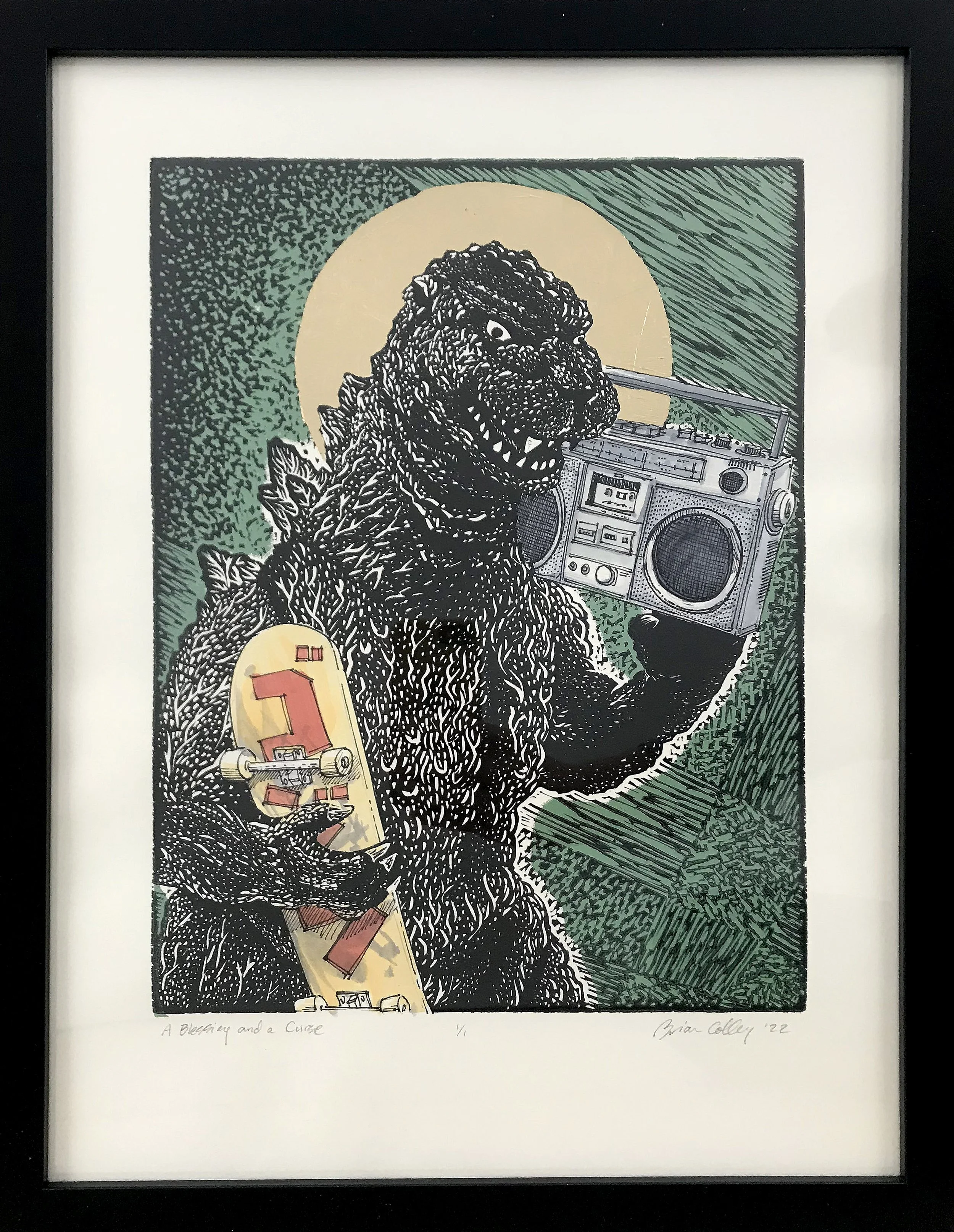 Series of hand embellished linocut prints titled "A Blessing and A Curse"